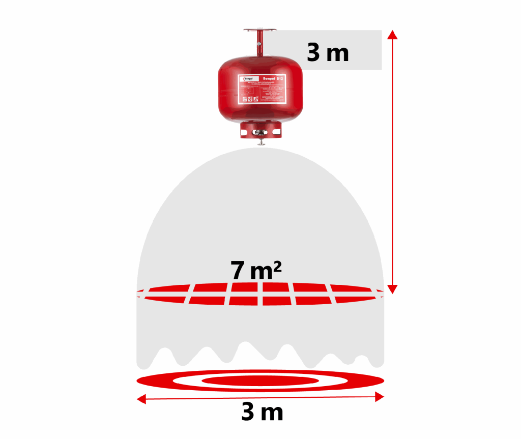 Naši automatski aparati dostupni su u različitim volumenima (2, 4, 6 ili 12 l) te s različitim temperaturama aktivacije (od 57°C do 182°C), ovisno o vašim specifičnim zahtjevima. Na svim inačicama automatskih aparata koriste se mlaznice istog tipa. Prilikom aktivacije, snop gašenja je u obliku parabole. Kako bi se postigla maksimalna pokrivenost od 7 m², aparat mora biti postavljen na visini od 3 m ili više. U slučaju niže montaže, područje pokrivenosti proporcionalno se smanjuje.